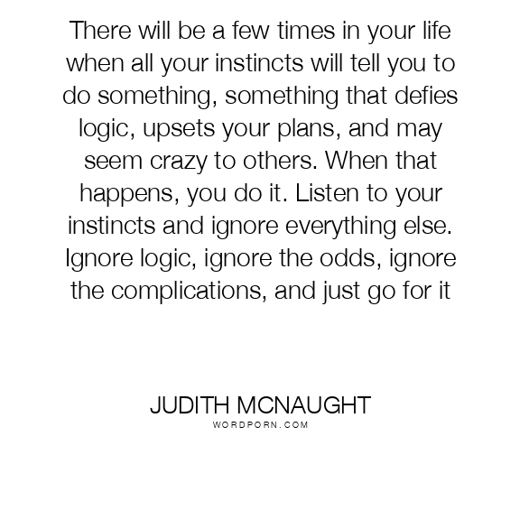 Judith McNaught quote. There will be a few times in your life when all your instincts will tell you to do something, something that defies logic, upsets your plans, and may seem crazy to others. When that happens, you do it. Listen to your instincts and ignore everything else. Ignore logic, ignore the odds, ignore the complications, and just go for it