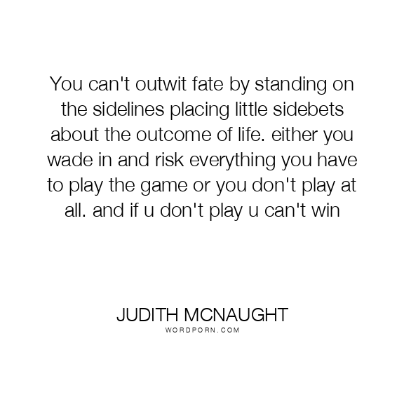 Judith McNaught quote. You can't outwit fate by standing on the sidelines placing little sidebets about the outcome of life. either you wade in and risk everything you have to play the game or you don't play at all. and if u don't play u can't win