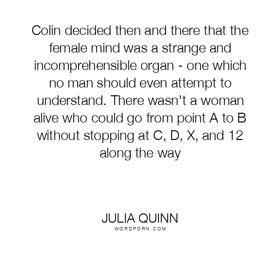 Colin decided then and there that the female mind was a strange and incomprehensible organ - one which no man should even attempt to understand. There wasn't a woman alive who could go from point A to B without stopping at C, D, X, and 12 along the way