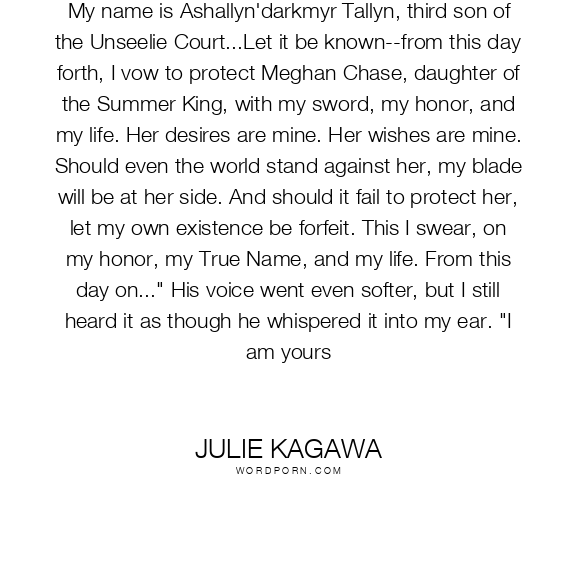 My name is Ashallyn'darkmyr Tallyn, third son of the Unseelie Court...Let it be known--from this day forth, I vow to protect Meghan Chase, daughter of the Summer King, with my sword, my honor, and my life. Her desires are mine. Her wishes are mine. Should even the world stand against her, my blade will be at her side. And should it fail to protect her, let my own existence be forfeit. This I swear, on my honor, my True Name, and my life. From this day on..." His voice went even softer, but I still heard it as though he whispered it into my ear. "I am yours