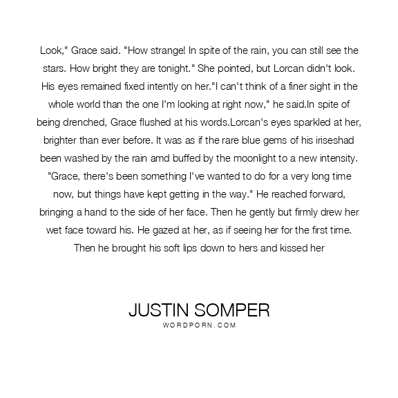 Look," Grace said. "How strange! In spite of the rain, you can still see the stars. How bright they are tonight." She pointed, but Lorcan didn't look. His eyes remained fixed intently on her."I can't think of a finer sight in the whole world than the one I'm looking at right now," he said.In spite of being drenched, Grace flushed at his words.Lorcan's eyes sparkled at her, brighter than ever before. It was as if the rare blue gems of his iriseshad been washed by the rain amd buffed by the moonlight to a new intensity. "Grace, there's been something I've wanted to do for a very long time now, but things have kept getting in the way." He reached forward, bringing a hand to the side of her face. Then he gently but firmly drew her wet face toward his. He gazed at her, as if seeing her for the first time. Then he brought his soft lips down to hers and kissed her
