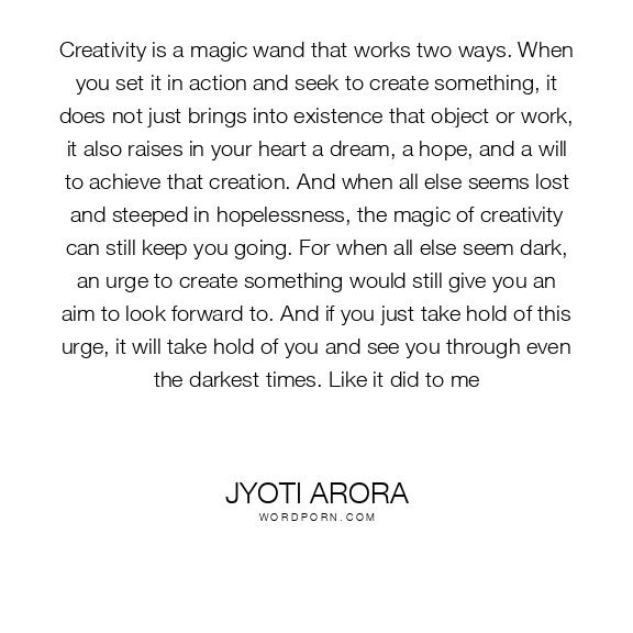 Creativity is a magic wand that works two ways. When you set it in action and seek to create something, it does not just brings into existence that object or work, it also raises in your heart a dream, a hope, and a will to achieve that creation. And when all else seems lost and steeped in hopelessness, the magic of creativity can still keep you going. For when all else seem dark, an urge to create something would still give you an aim to look forward to. And if you just take hold of this urge, it will take hold of you and see you through even the darkest times. Like it did to me