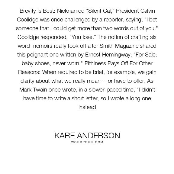 Brevity Is Best: Nicknamed "Silent Cal," President Calvin Coolidge was once challenged by a reporter, saying, "I bet someone that I could get more than two words out of you." Coolidge responded, "You lose." The notion of crafting six word memoirs really took off after Smith Magazine shared this poignant one written by Ernest Hemingway: "For Sale: baby shoes, never worn." Pithiness Pays Off For Other Reasons: When required to be brief, for example, we gain clarity about what we really mean -- or have to offer. As Mark Twain once wrote, in a slower-paced time, "I didn't have time to write a short letter, so I wrote a long one instead