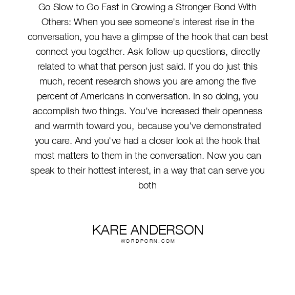 Kare Anderson quote. Go Slow to Go Fast in Growing a Stronger Bond With Others: When you see someone's interest rise in the conversation, you have a glimpse of the hook that can best connect you together. Ask follow-up questions, directly related to what that person just said. If you do just this much, recent research shows you are among the five percent of Americans in conversation. In so doing, you accomplish two things. You've increased their openness and warmth toward you, because you've demonstrated you care. And you've had a closer look at the hook that most matters to them in the conversation. Now you can speak to their hottest interest, in a way that can serve you both