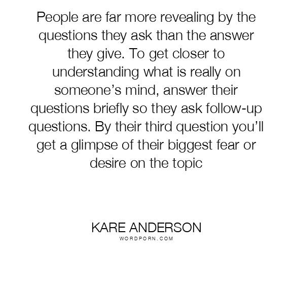 Kare Anderson quote. People are far more revealing by the questions they ask than the answer they give. To get closer to understanding what is really on someone’s mind, answer their questions briefly so they ask follow-up questions. By their third question you’ll get a glimpse of their biggest fear or desire on the topic