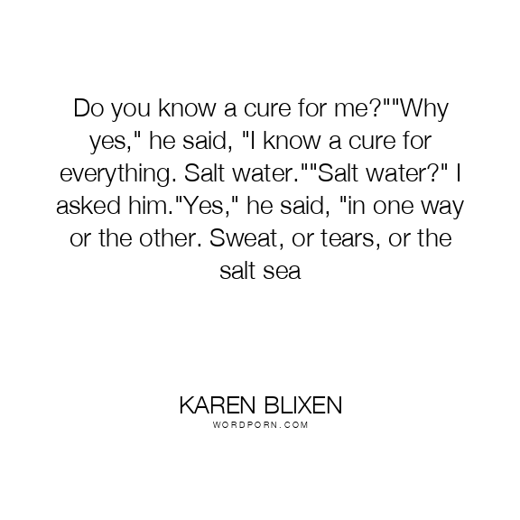 Do you know a cure for me?""Why yes," he said, "I know a cure for everything. Salt water.""Salt water?" I asked him."Yes," he said, "in one way or the other. Sweat, or tears, or the salt sea