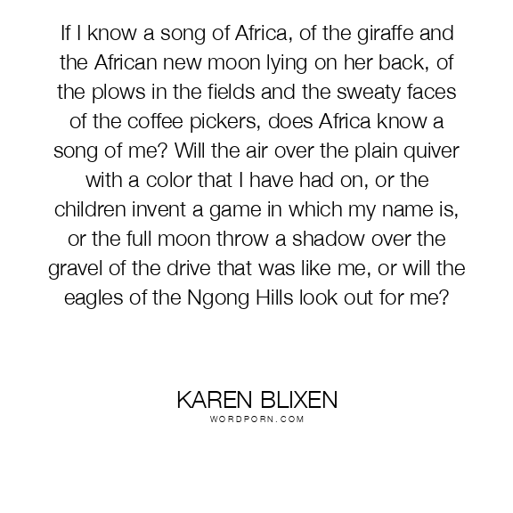 If I know a song of Africa, of the giraffe and the African new moon lying on her back, of the plows in the fields and the sweaty faces of the coffee pickers, does Africa know a song of me? Will the air over the plain quiver with a color that I have had on, or the children invent a game in which my name is, or the full moon throw a shadow over the gravel of the drive that was like me, or will the eagles of the Ngong Hills look out for me?