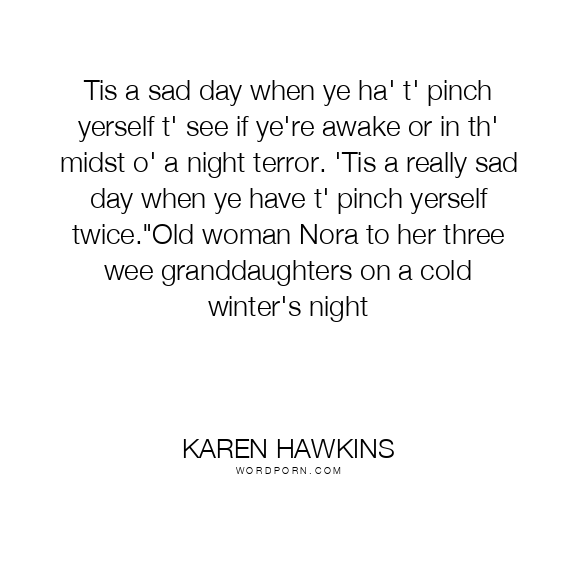 Tis a sad day when ye ha' t' pinch yerself t' see if ye're awake or in th' midst o' a night terror. 'Tis a really sad day when ye have t' pinch yerself twice."Old woman Nora to her three wee granddaughters on a cold winter's night