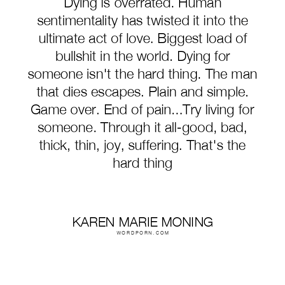 Dying is overrated. Human sentimentality has twisted it into the ultimate act of love. Biggest load of bullshit in the world. Dying for someone isn't the hard thing. The man that dies escapes. Plain and simple. Game over. End of pain...Try living for someone. Through it all-good, bad, thick, thin, joy, suffering. That's the hard thing