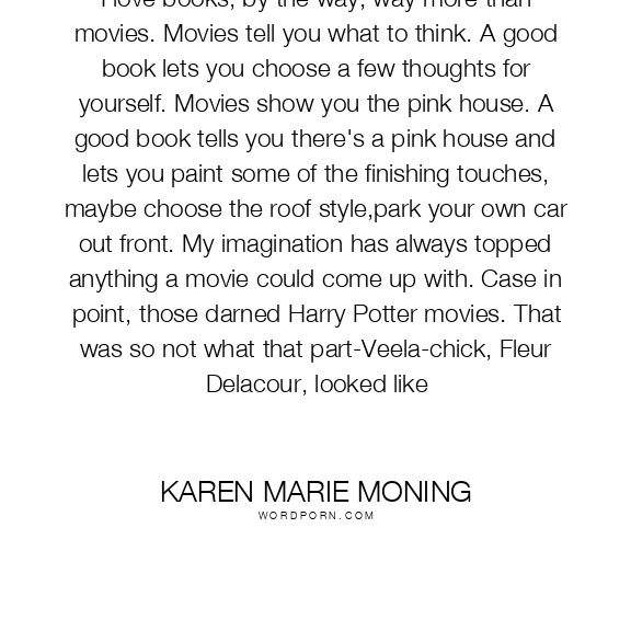I love books, by the way, way more than movies. Movies tell you what to think. A good book lets you choose a few thoughts for yourself. Movies show you the pink house. A good book tells you there's a pink house and lets you paint some of the finishing touches, maybe choose the roof style,park your own car out front. My imagination has always topped anything a movie could come up with. Case in point, those darned Harry Potter movies. That was so not what that part-Veela-chick, Fleur Delacour, looked like