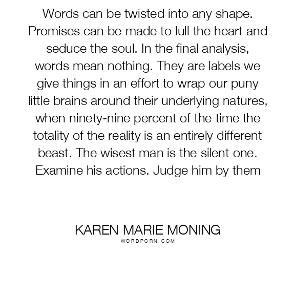 Words can be twisted into any shape. Promises can be made to lull the heart and seduce the soul. In the final analysis, words mean nothing. They are labels we give things in an effort to wrap our puny little brains around their underlying natures, when ninety-nine percent of the time the totality of the reality is an entirely different beast. The wisest man is the silent one. Examine his actions. Judge him by them