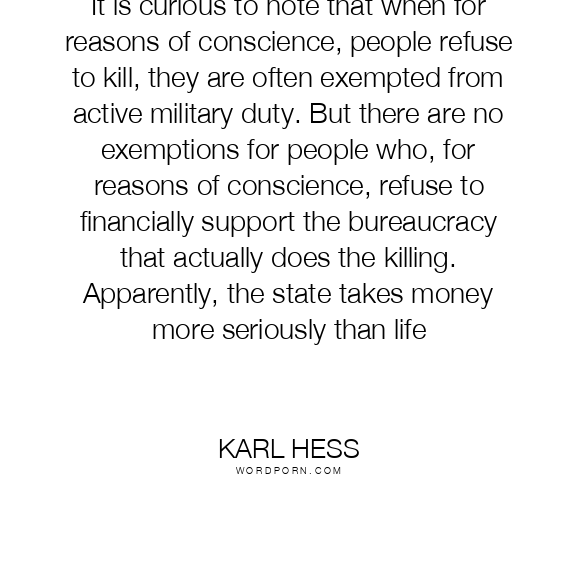 It is curious to note that when for reasons of conscience, people refuse to kill, they are often exempted from active military duty. But there are no exemptions for people who, for reasons of conscience, refuse to financially support the bureaucracy that actually does the killing. Apparently, the state takes money more seriously than life