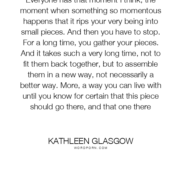 Everyone has that moment I think, the moment when something so momentous happens that it rips your very being into small pieces. And then you have to stop. For a long time, you gather your pieces. And it takes such a very long time, not to fit them back together, but to assemble them in a new way, not necessarily a better way. More, a way you can live with until you know for certain that this piece should go there, and that one there