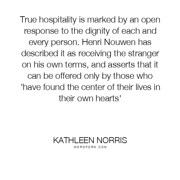 True hospitality is marked by an open response to the dignity of each and every person. Henri Nouwen has described it as receiving the stranger on his own terms, and asserts that it can be offered only by those who 'have found the center of their lives in their own hearts'