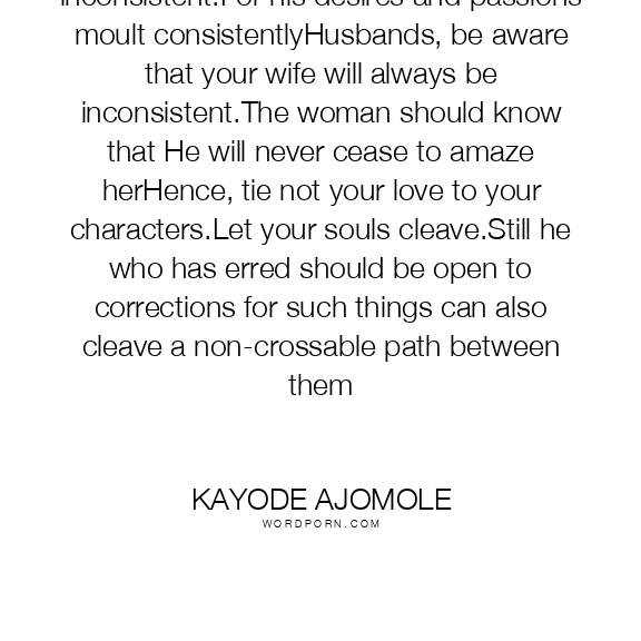 Man may never stop being inconsistent.For his desires and passions moult consistentlyHusbands, be aware that your wife will always be inconsistent.The woman should know that He will never cease to amaze herHence, tie not your love to your characters.Let your souls cleave.Still he who has erred should be open to corrections for such things can also cleave a non-crossable path between them