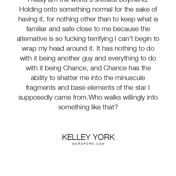 I really am the world's shittiest boyfriend. Holding onto something normal for the sake of having it, for nothing other than to keep what is familiar and safe close to me because the alternative is so fucking terrifying I can't begin to wrap my head around it. It has nothing to do with it being another guy and everything to do with it being Chance, and Chance has the ability to shatter me into the minuscule fragments and base elements of the star I supposedly came from.Who walks willingly into something like that?