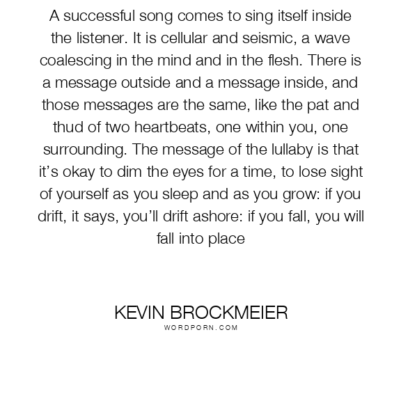 A successful song comes to sing itself inside the listener. It is cellular and seismic, a wave coalescing in the mind and in the flesh. There is a message outside and a message inside, and those messages are the same, like the pat and thud of two heartbeats, one within you, one surrounding. The message of the lullaby is that it’s okay to dim the eyes for a time, to lose sight of yourself as you sleep and as you grow: if you drift, it says, you’ll drift ashore: if you fall, you will fall into place