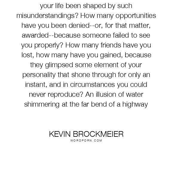 How often, you wonder, has the direction of your life been shaped by such misunderstandings? How many opportunities have you been denied--or, for that matter, awarded--because someone failed to see you properly? How many friends have you lost, how many have you gained, because they glimpsed some element of your personality that shone through for only an instant, and in circumstances you could never reproduce? An illusion of water shimmering at the far bend of a highway