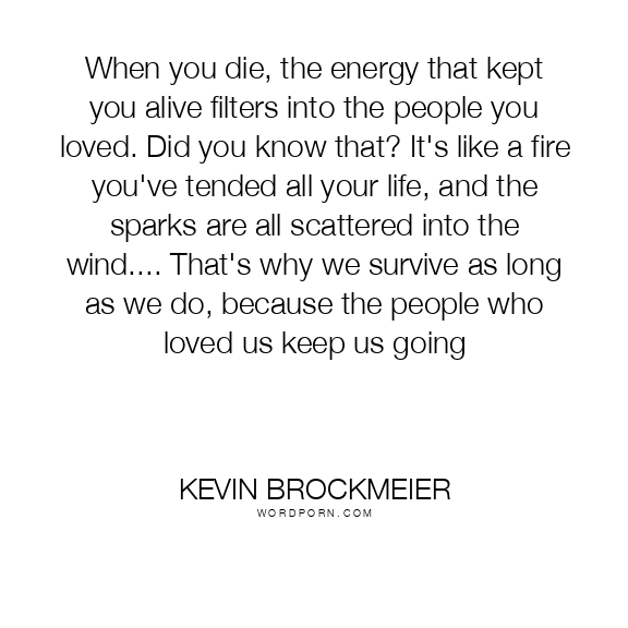 When you die, the energy that kept you alive filters into the people you loved. Did you know that? It's like a fire you've tended all your life, and the sparks are all scattered into the wind.... That's why we survive as long as we do, because the people who loved us keep us going