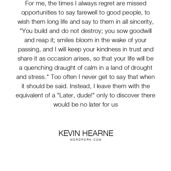 For me, the times I always regret are missed opportunities to say farewell to good people, to wish them long life and say to them in all sincerity, "You build and do not destroy; you sow goodwill and reap it; smiles bloom in the wake of your passing, and I will keep your kindness in trust and share it as occasion arises, so that your life will be a quenching draught of calm in a land of drought and stress." Too often I never get to say that when it should be said. Instead, I leave them with the equivalent of a "Later, dude!" only to discover there would be no later for us