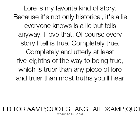 Lore is my favorite kind of story. Because it's not only historical, it's a lie everyone knows is a lie but tells anyway. I love that. Of course every story I tell is true. Completely true. Completely and utterly at least five-eighths of the way to being true, which is truer than any piece of lore and truer than most truths you'll hear