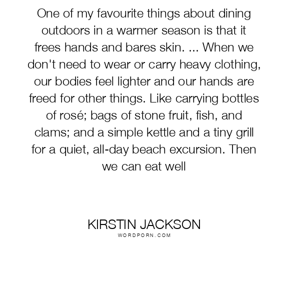One of my favourite things about dining outdoors in a warmer season is that it frees hands and bares skin. ... When we don't need to wear or carry heavy clothing, our bodies feel lighter and our hands are freed for other things. Like carrying bottles of rosé; bags of stone fruit, fish, and clams; and a simple kettle and a tiny grill for a quiet, all-day beach excursion. Then we can eat well