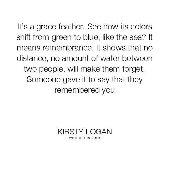It’s a grace feather. See how its colors shift from green to blue, like the sea? It means remembrance. It shows that no distance, no amount of water between two people, will make them forget. Someone gave it to say that they remembered you