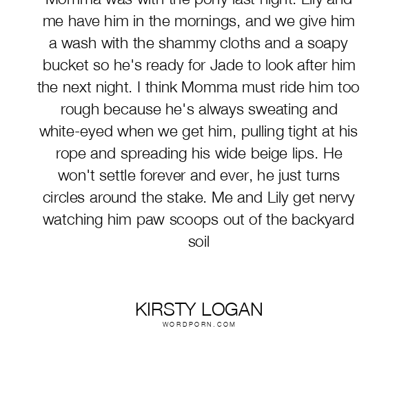 Momma was with the pony last night. Lily and me have him in the mornings, and we give him a wash with the shammy cloths and a soapy bucket so he's ready for Jade to look after him the next night. I think Momma must ride him too rough because he's always sweating and white-eyed when we get him, pulling tight at his rope and spreading his wide beige lips. He won't settle forever and ever, he just turns circles around the stake. Me and Lily get nervy watching him paw scoops out of the backyard soil