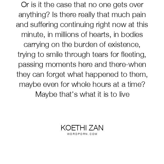 Or is it the case that no one gets over anything? Is there really that much pain and suffering continuing right now at this minute, in millions of hearts, in bodies carrying on the burden of existence, trying to smile through tears for fleeting, passing moments here and there-when they can forget what happened to them, maybe even for whole hours at a time? Maybe that's what it is to live