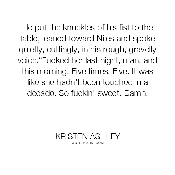 He put the knuckles of his fist to the table, leaned toward Niles and spoke quietly, cuttingly, in his rough, gravelly voice.“Fucked her last night, man, and this morning. Five times. Five. It was like she hadn’t been touched in a decade. So fuckin’ sweet. Damn,