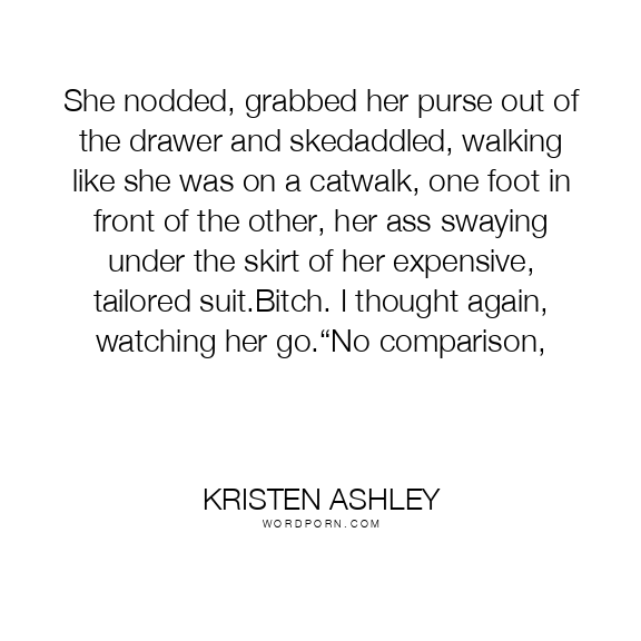 She nodded, grabbed her purse out of the drawer and skedaddled, walking like she was on a catwalk, one foot in front of the other, her ass swaying under the skirt of her expensive, tailored suit.Bitch. I thought again, watching her go.“No comparison,