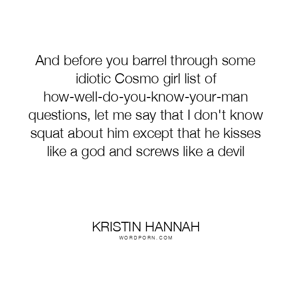 And before you barrel through some idiotic Cosmo girl list of how-well-do-you-know-your-man questions, let me say that I don't know squat about him except that he kisses like a god and screws like a devil