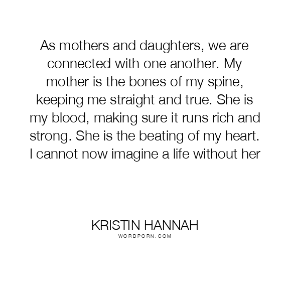 As mothers and daughters, we are connected with one another. My mother is the bones of my spine, keeping me straight and true. She is my blood, making sure it runs rich and strong. She is the beating of my heart. I cannot now imagine a life without her