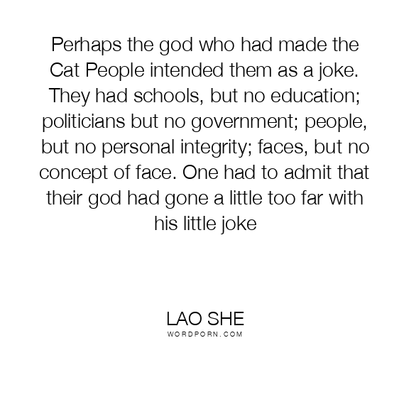 Perhaps the god who had made the Cat People intended them as a joke. They had schools, but no education; politicians but no government; people, but no personal integrity; faces, but no concept of face. One had to admit that their god had gone a little too far with his little joke