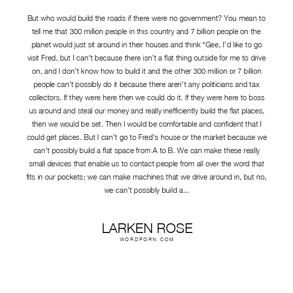 But who would build the roads if there were no government? You mean to tell me that 300 million people in this country and 7 billion people on the planet would just sit around in their houses and think “Gee, I’d like to go visit Fred, but I can't because there isn’t a flat thing outside for me to drive on, and I don’t know how to build it and the other 300 million or 7 billion people can’t possibly do it because there aren’t any politicians and tax collectors. If they were here then we could do it. If they were here to boss us around and steal our money and really inefficiently build the flat places, then we would be set. Then I would be comfortable and confident that I could get places. But I can’t go to Fred’s house or the market because we can’t possibly build a flat space from A to B. We can make these really small devices that enable us to contact people from all over the word that fits in our pockets; we can make machines that we drive around in, but no, we can’t possibly build a flat space