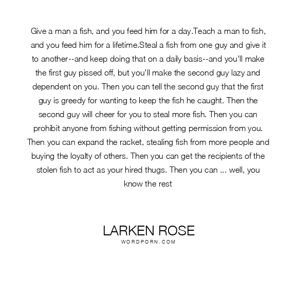 Give a man a fish, and you feed him for a day.Teach a man to fish, and you feed him for a lifetime.Steal a fish from one guy and give it to another--and keep doing that on a daily basis--and you'll make the first guy pissed off, but you'll make the second guy lazy and dependent on you. Then you can tell the second guy that the first guy is greedy for wanting to keep the fish he caught. Then the second guy will cheer for you to steal more fish. Then you can prohibit anyone from fishing without getting permission from you. Then you can expand the racket, stealing fish from more people and buying the loyalty of others. Then you can get the recipients of the stolen fish to act as your hired thugs. Then you can ... well, you know the rest