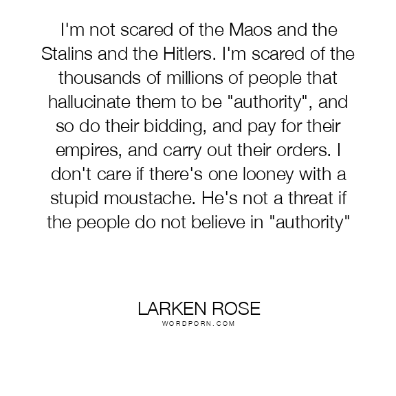 I'm not scared of the Maos and the Stalins and the Hitlers. I'm scared of the thousands of millions of people that hallucinate them to be "authority", and so do their bidding, and pay for their empires, and carry out their orders. I don't care if there's one looney with a stupid moustache. He's not a threat if the people do not believe in "authority"