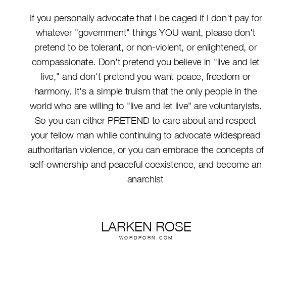 If you personally advocate that I be caged if I don't pay for whatever "government" things YOU want, please don't pretend to be tolerant, or non-violent, or enlightened, or compassionate. Don't pretend you believe in "live and let live," and don't pretend you want peace, freedom or harmony. It's a simple truism that the only people in the world who are willing to "live and let live" are voluntaryists. So you can either PRETEND to care about and respect your fellow man while continuing to advocate widespread authoritarian violence, or you can embrace the concepts of self-ownership and peaceful coexistence, and become an anarchist
