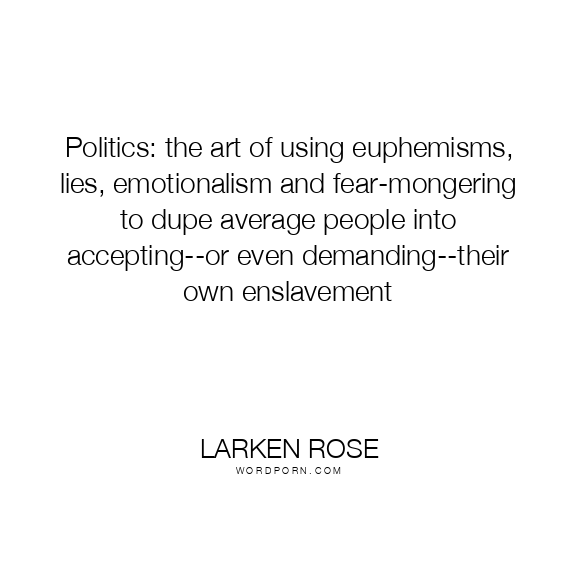 Politics: the art of using euphemisms, lies, emotionalism and fear-mongering to dupe average people into accepting--or even demanding--their own enslavement