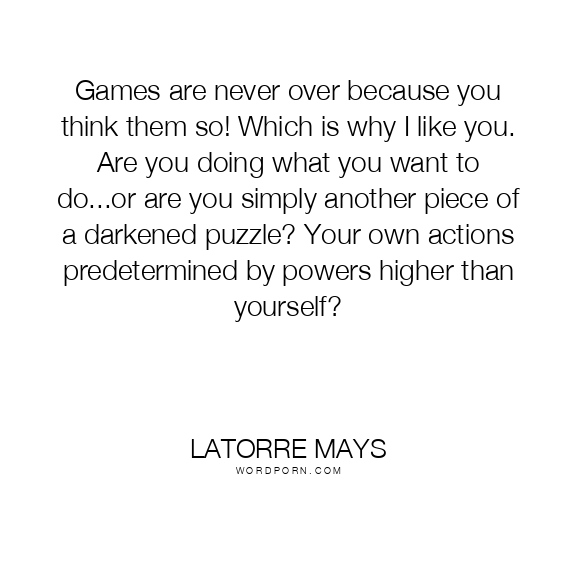Games are never over because you think them so! Which is why I like you. Are you doing what you want to do...or are you simply another piece of a darkened puzzle? Your own actions predetermined by powers higher than yourself?