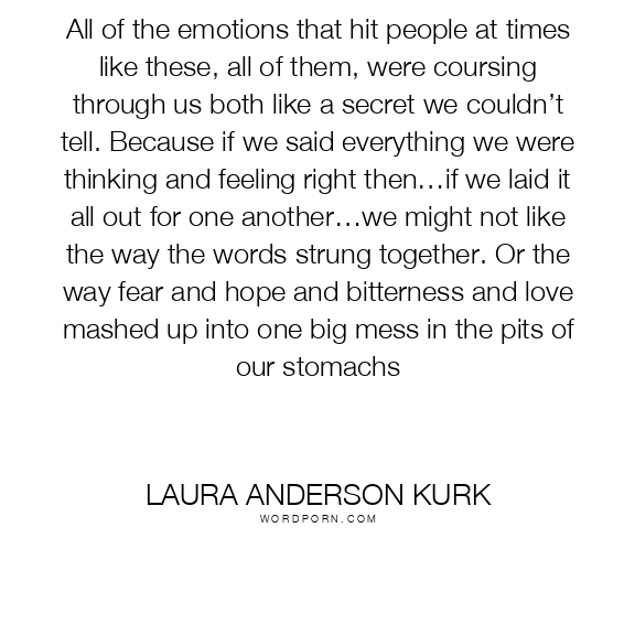 All of the emotions that hit people at times like these, all of them, were coursing through us both like a secret we couldn’t tell. Because if we said everything we were thinking and feeling right then…if we laid it all out for one another…we might not like the way the words strung together. Or the way fear and hope and bitterness and love mashed up into one big mess in the pits of our stomachs