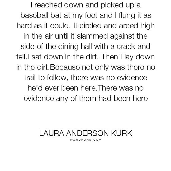 I reached down and picked up a baseball bat at my feet and I flung it as hard as it could. It circled and arced high in the air until it slammed against the side of the dining hall with a crack and fell.I sat down in the dirt. Then I lay down in the dirt.Because not only was there no trail to follow, there was no evidence he’d ever been here.There was no evidence any of them had been here