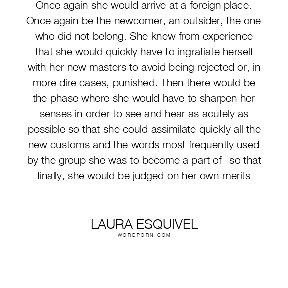 Once again she would arrive at a foreign place. Once again be the newcomer, an outsider, the one who did not belong. She knew from experience that she would quickly have to ingratiate herself with her new masters to avoid being rejected or, in more dire cases, punished. Then there would be the phase where she would have to sharpen her senses in order to see and hear as acutely as possible so that she could assimilate quickly all the new customs and the words most frequently used by the group she was to become a part of--so that finally, she would be judged on her own merits