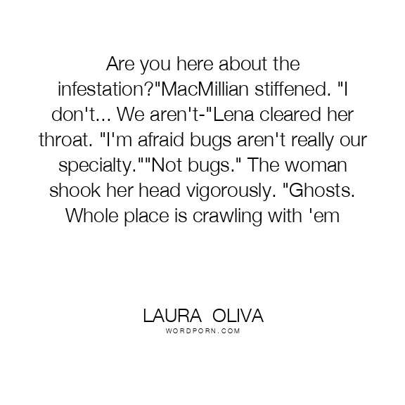 Are you here about the infestation?"MacMillian stiffened. "I don't... We aren't-"Lena cleared her throat. "I'm afraid bugs aren't really our specialty.""Not bugs." The woman shook her head vigorously. "Ghosts. Whole place is crawling with 'em