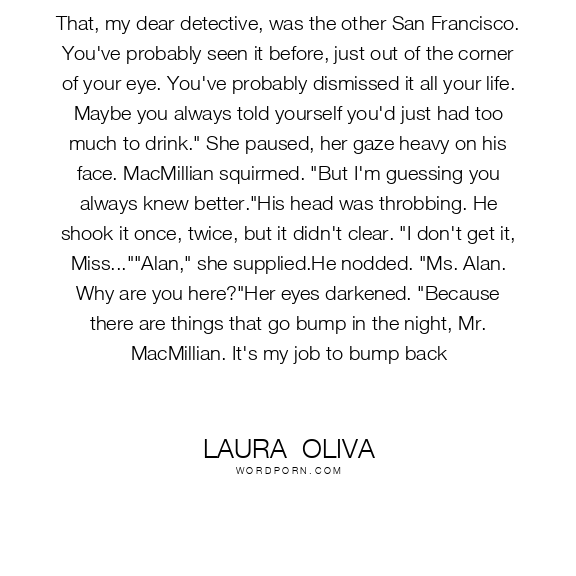 That, my dear detective, was the other San Francisco. You've probably seen it before, just out of the corner of your eye. You've probably dismissed it all your life. Maybe you always told yourself you'd just had too much to drink." She paused, her gaze heavy on his face. MacMillian squirmed. "But I'm guessing you always knew better."His head was throbbing. He shook it once, twice, but it didn't clear. "I don't get it, Miss...""Alan," she supplied.He nodded. "Ms. Alan. Why are you here?"Her eyes darkened. "Because there are things that go bump in the night, Mr. MacMillian. It's my job to bump back