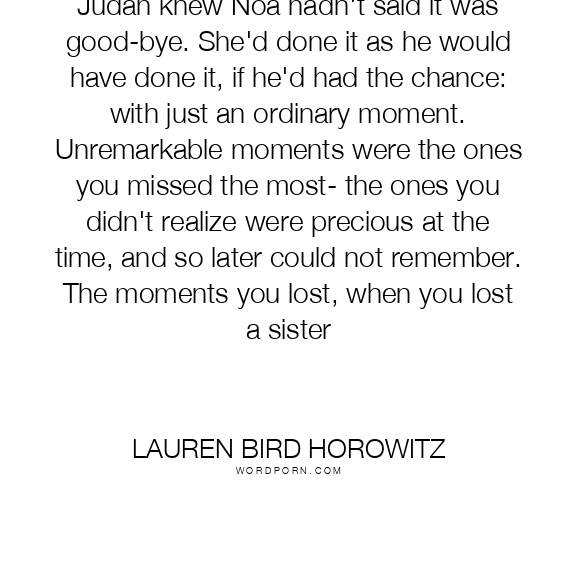 Judah knew Noa hadn't said it was good-bye. She'd done it as he would have done it, if he'd had the chance: with just an ordinary moment. Unremarkable moments were the ones you missed the most- the ones you didn't realize were precious at the time, and so later could not remember. The moments you lost, when you lost a sister