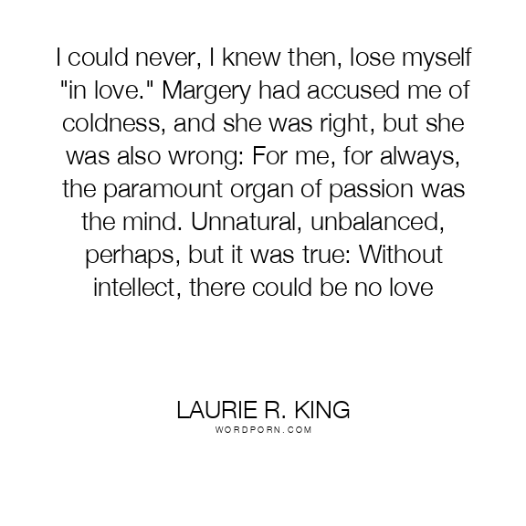 I could never, I knew then, lose myself "in love." Margery had accused me of coldness, and she was right, but she was also wrong: For me, for always, the paramount organ of passion was the mind. Unnatural, unbalanced, perhaps, but it was true: Without intellect, there could be no love