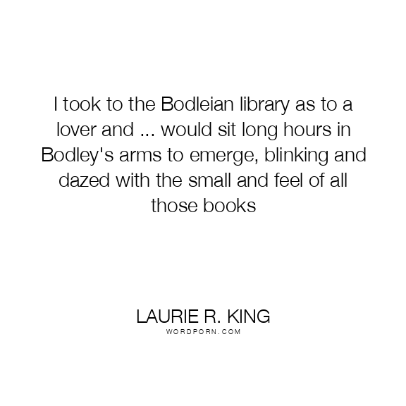 Laurie R. King quote. I took to the Bodleian library as to a lover and ... would sit long hours in Bodley's arms to emerge, blinking and dazed with the small and feel of all those books