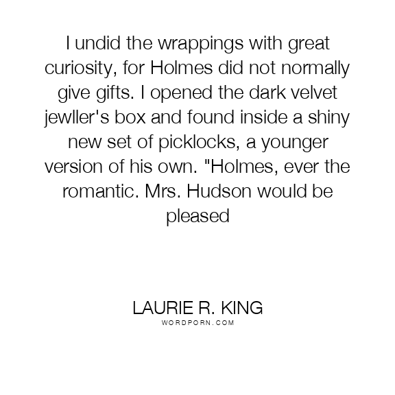Laurie R. King quote. I undid the wrappings with great curiosity, for Holmes did not normally give gifts. I opened the dark velvet jewller's box and found inside a shiny new set of picklocks, a younger version of his own.