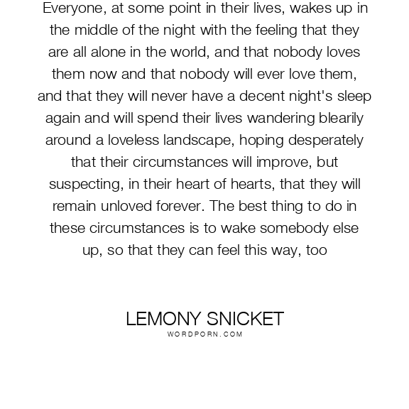 Everyone, at some point in their lives, wakes up in the middle of the night with the feeling that they are all alone in the world, and that nobody loves them now and that nobody will ever love them, and that they will never have a decent night's sleep again and will spend their lives wandering blearily around a loveless landscape, hoping desperately that their circumstances will improve, but suspecting, in their heart of hearts, that they will remain unloved forever. The best thing to do in these circumstances is to wake somebody else up, so that they can feel this way, too